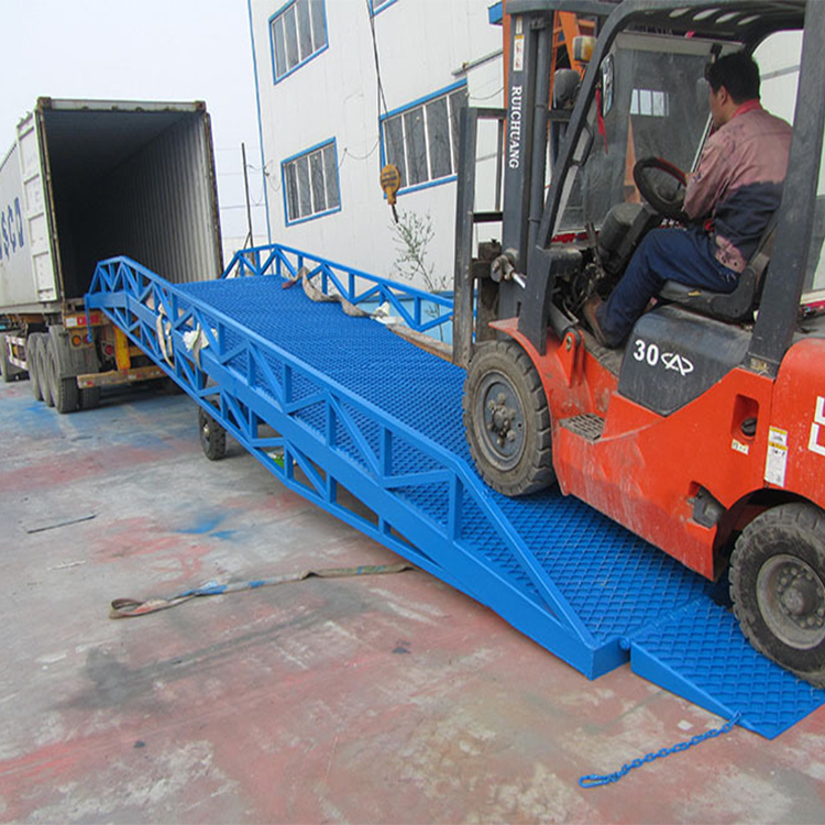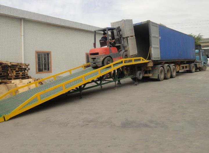 液压登车桥是实现货物快速装卸的专用辅助设备,它的高度调节功能使货车与库房的货台之间架起一座桥梁,叉车等搬运车辆通过它能直接驶入货车内部进行货物的批量装卸,仅需单人作业,即可实现货物的快速装卸。移动液压登车桥使企业减少大量劳力,提高工作效率,获取更大经济效益。台面均设计为网格状钢板,这种结构能保证具有很好的强度,又具有防滑功能,还能方便地清扫工作台面,使它能经常地保持清洁、美观。移动液压登车桥无须外接电源,通过手摇泵做动力能轻松地在其整个调整范围内按50mm的倍数进行高度的调整,可以充分适应各种不同高度的货车。