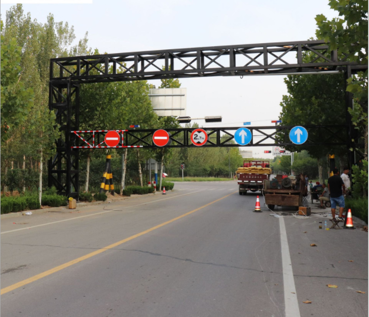固定一体限高架主要用于桥梁、涵洞、隧道入口处的门型构架,一般为钢结构焊接而成,起防护桥梁、涵洞、隧道的作用;上有标志牌,标有限高米数,用于提示车辆。