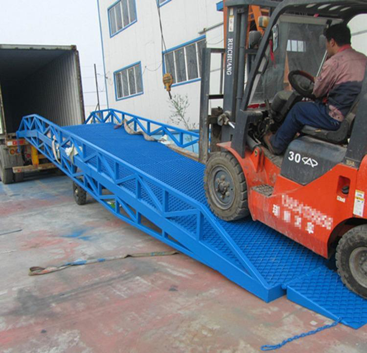 移动式登车桥广泛用于无装卸设备的货台及流动装卸场所,是与叉车配合使用的货物装卸辅助设备,可根据汽车车厢的高低调节高度、借助该设备,叉车能直接驶入汽车车厢内部进行批量装卸作业,只需单人操作,不需动力电源,即可实现货物的安全快速装卸,即使您减轻劳动强度,又能成倍提高装卸作业效率,加快物料流通速度,获得好的经济效益。