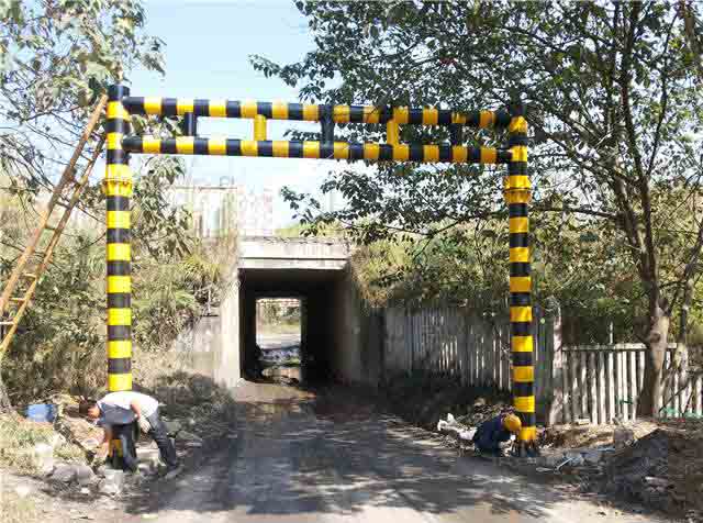 固定限高架又分为固定一体限高架和固定撞不坏限高架。固定一体限高架为一次性不可调节高度限高架,靠架子本身拦截车辆,固定式撞不坏限高架在紧急情况下要达到车辆通行必须依靠外力抬起,比如吊车等;