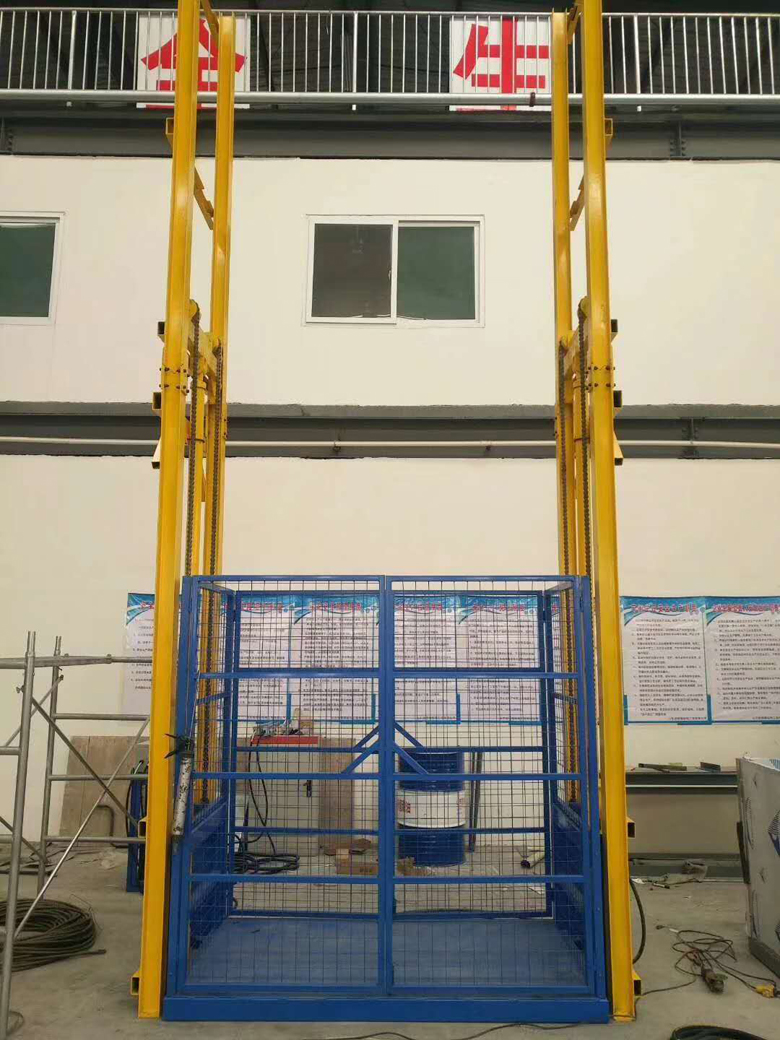 导轨式升降货梯是依靠液压系统作为动力单元,采用液压油缸作为主要动力,通过电机驱动液压油泵,使油缸直顶,驱动重型链条和油丝绳运动,从而带动货梯平台在轨道间平稳运行,是用于建筑层楼间、厂房、工厂、仓库运送货物的专用液压升降设备,起升高度从1米至20米不等,载重量从300公斤至30吨不等,是目前货物运输的较为理想的设备选择。